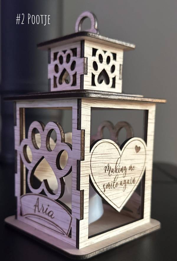 Personaliseer uw lantaarntje met een naam en een persoonlijke tekst. Voeg namen en de gewenste tekst toe in het opmerkingenveld of neem contact op via email. Dit lantaarntje is 15 cm hoog.